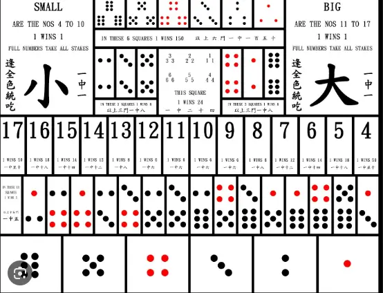 点数总和:猜三颗骰子的总点数,如“小”(4–10)或“大”(11–17)。