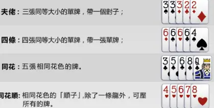 3️⃣ 玩家可出单张、对子、三条、或五张组合(同花顺、铁支、葫芦等);