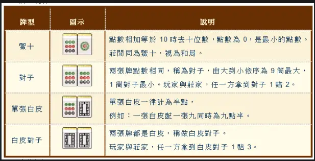 白皮对子 > 普通对子 > 9.5 > 9 > 8.5 > … > 鱉十